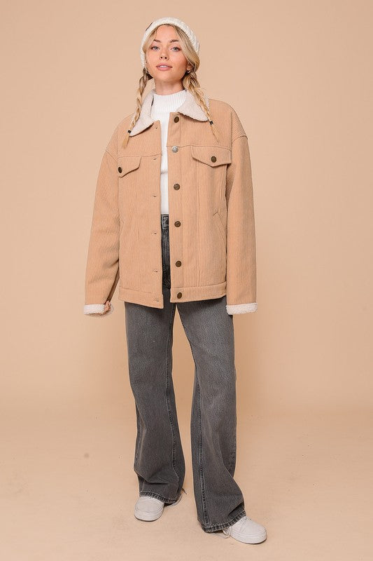 A cozy corduroy jacket featuring an oversized fit, long sleeves, and a button-down front. Complete with a plush sherpa lining all throughout, including the collar and cuff detailing. Stay warm, be trendy, and cozy!