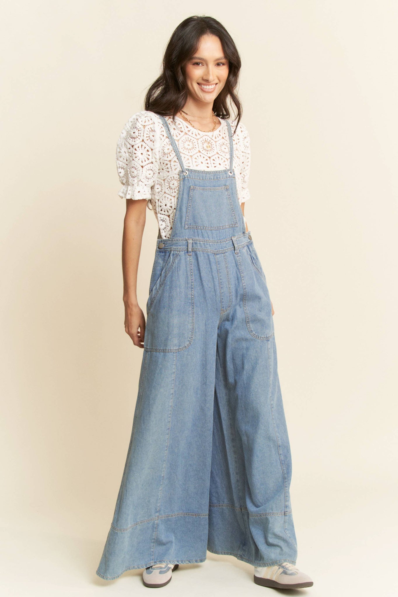 Year around closet staple!  These denim overalls are perfect!   Palazzo legs, exposed seams, sewn on pocket look and a fit that's sooo fun and trendy!