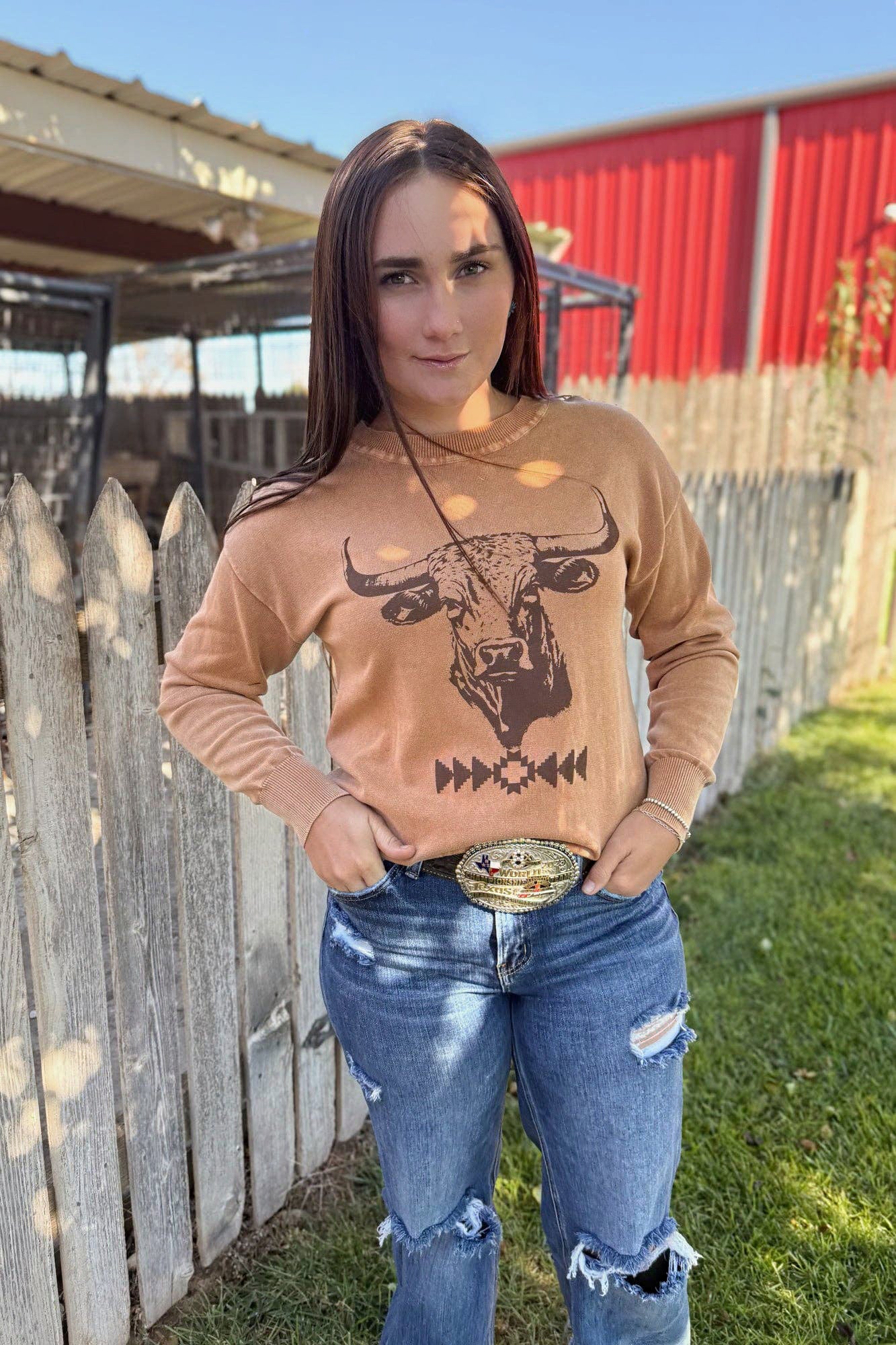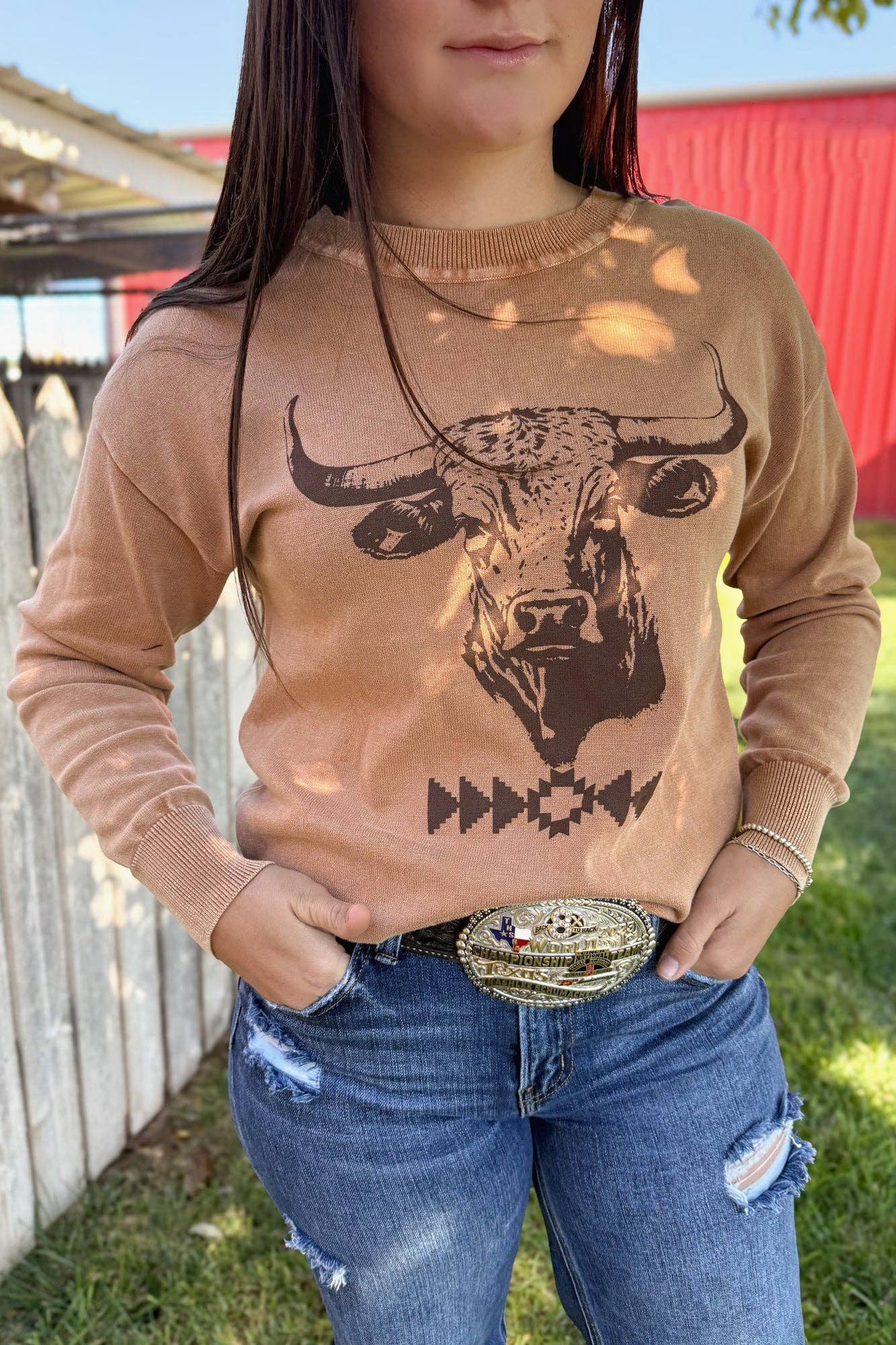 The Blazin' Bull Sweater brings warm desert tones and bold western art together in one easy, everyday layer. Featuring a striking bull graphic paired with a subtle southwestern motif, it’s soft, relaxed, and ranch-ready. Perfect for cool mornings, casual days, and anyone who likes their comfort with a little cowgirl grit.