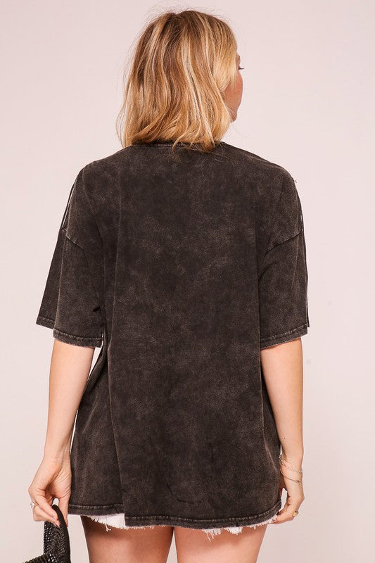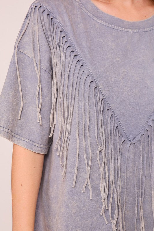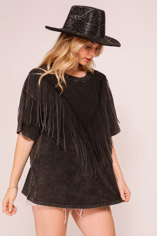 A touch of western charm to your casual wardrobe with our Fringed & Faded Tee. Designed with a relaxed, oversized fit and soft mineral-washed fabric, this top features a statement V-shaped fringe detail across the front and sleeves for a playful, boho-inspired look. Perfect for concerts, festivals, or weekend adventures, this tee pairs effortlessly with denim shorts or jeans for an effortlessly cool vibe or layered with a lace long sleeve to dress it up.