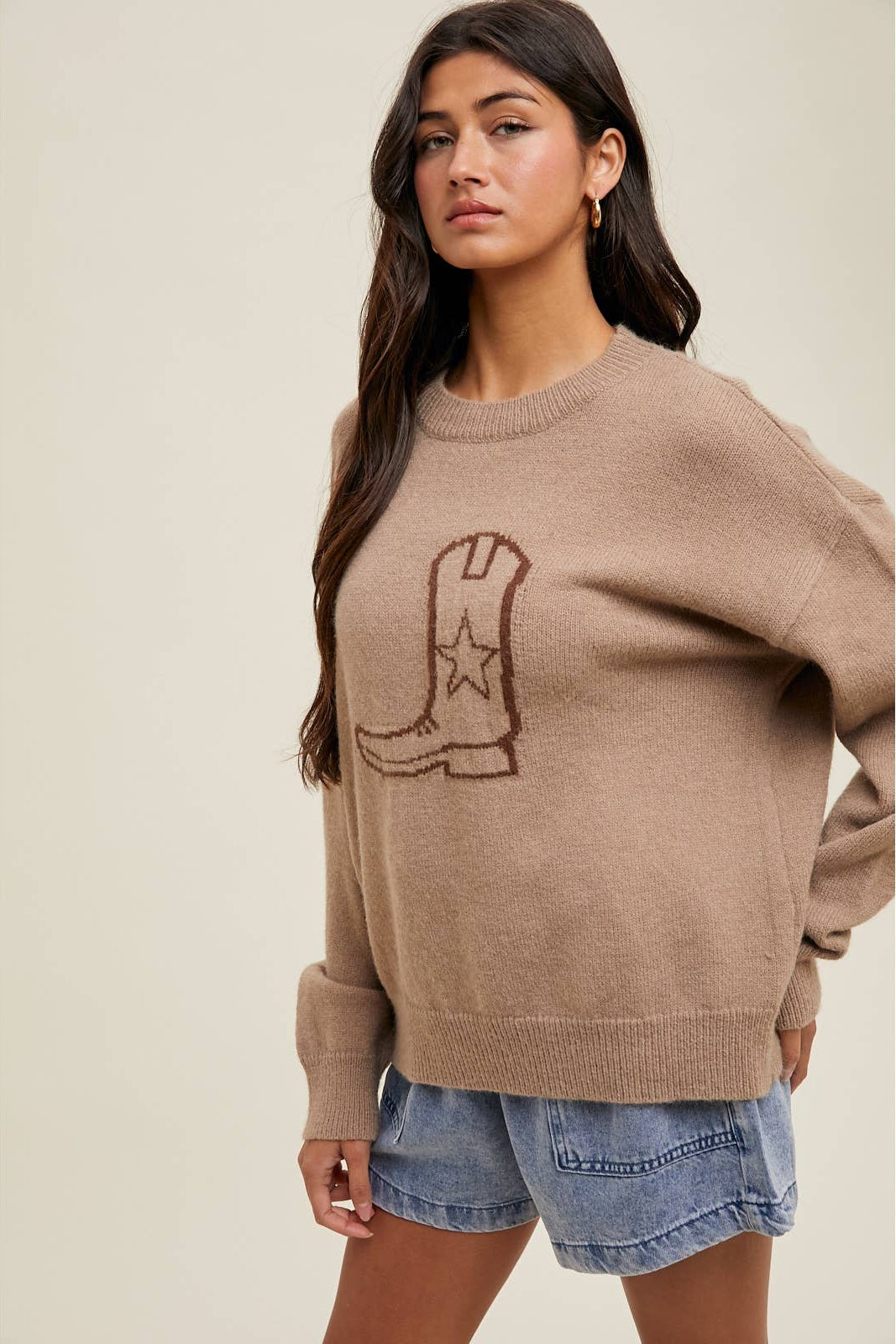 Gimme Fall sweaters, but make 'em western! Love this soft and cozy mocha sweater with a chocolate brown boot. Not busy, not loud, just a quiet "yeehaw" added to your look.