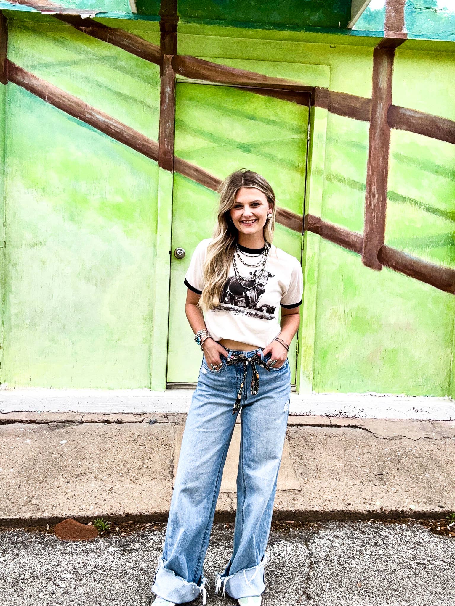 The vintage vibe is strong in this ringer tee featuring a horned Hereford bull in black & white. A graphic that is timeless, western, and easy to style.